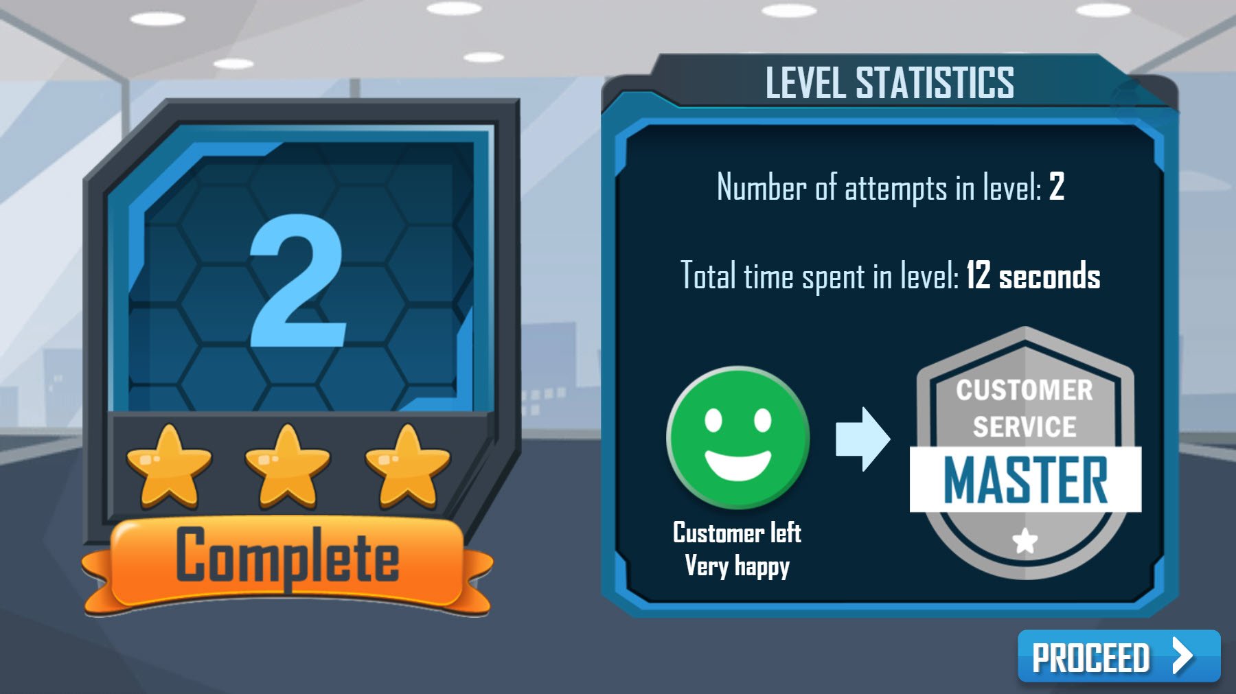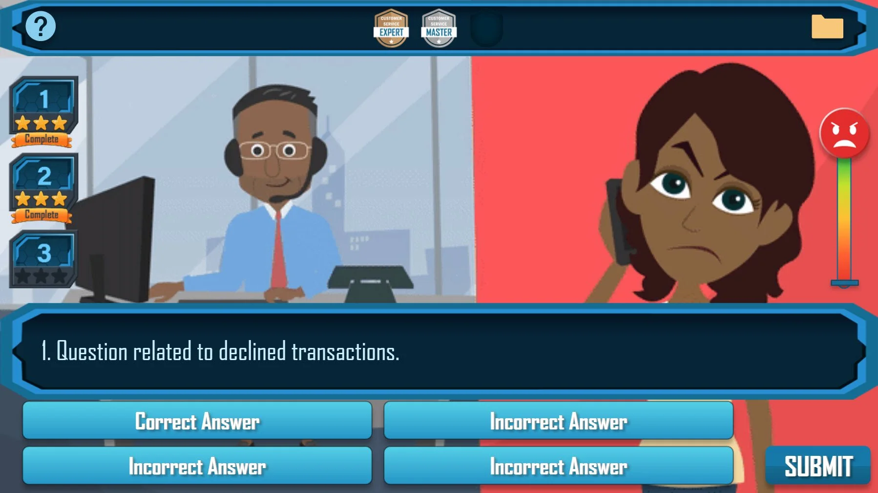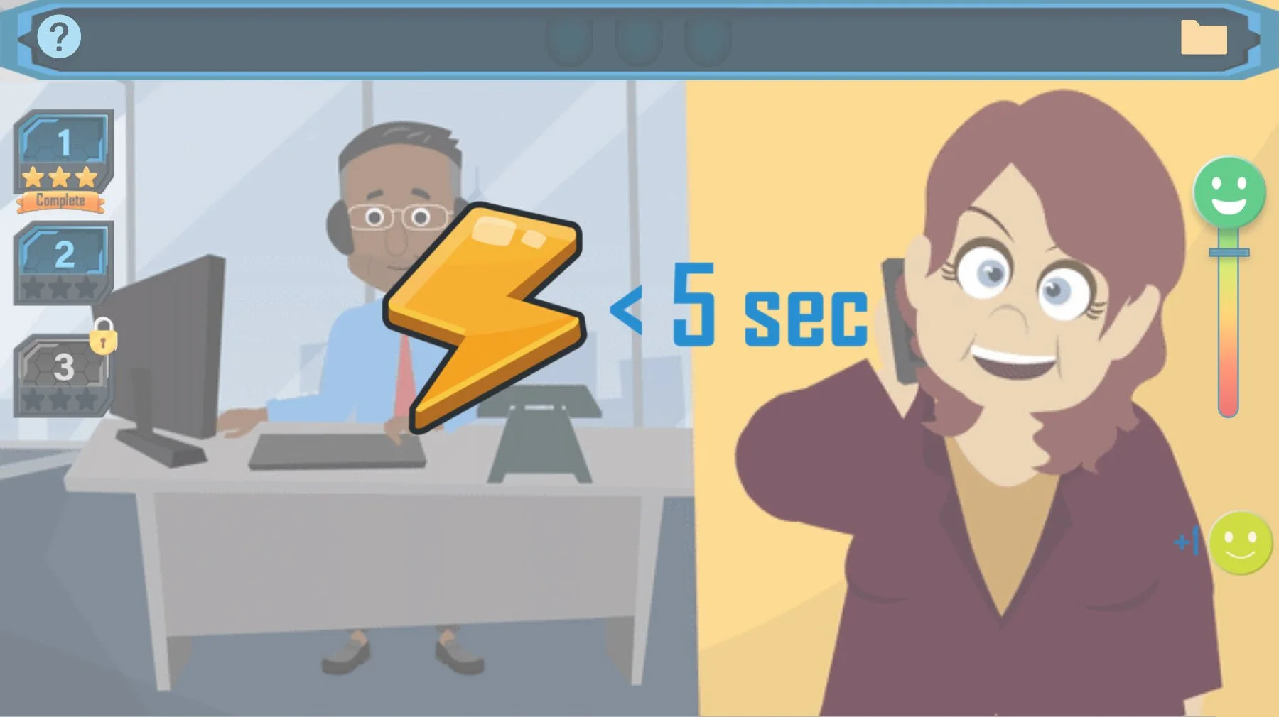 In this fast-paced customer service game, learners must answer customers' questions quickly and efficiently in order to complete levels and earn badges.