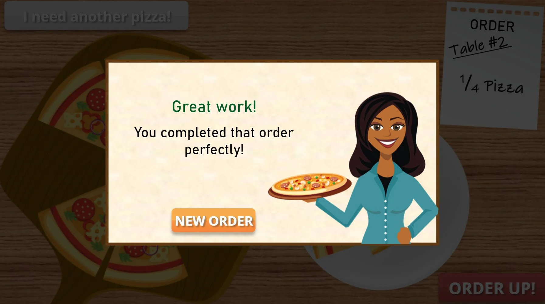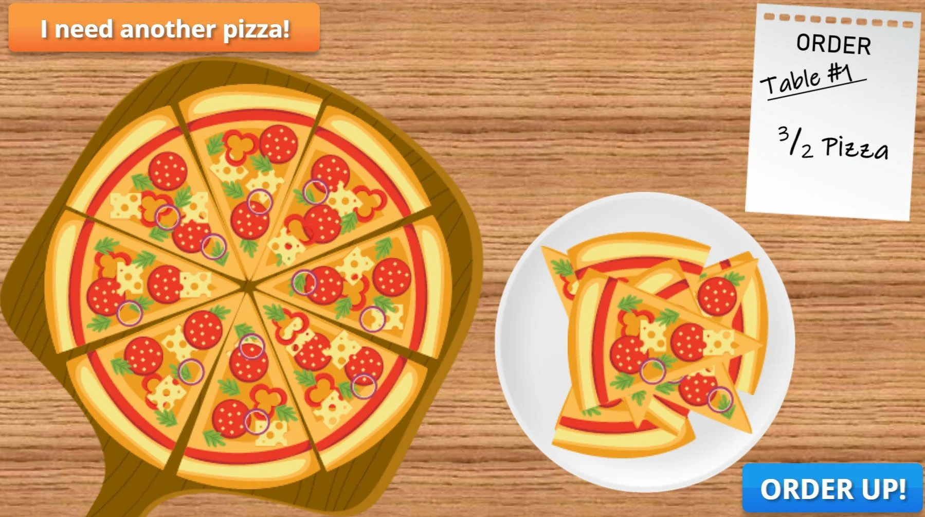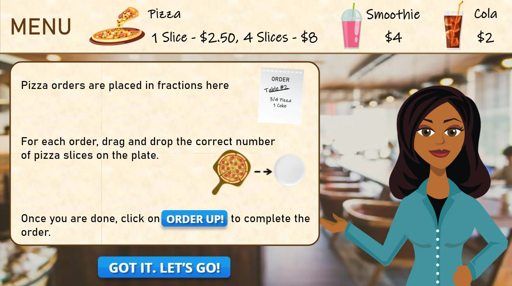 The module tests learners on their understanding of the concept of fractions by asking them to complete menu orders asking for various fractions of pizza. As the learner progresses through the module, the fractions get progressively harder.
